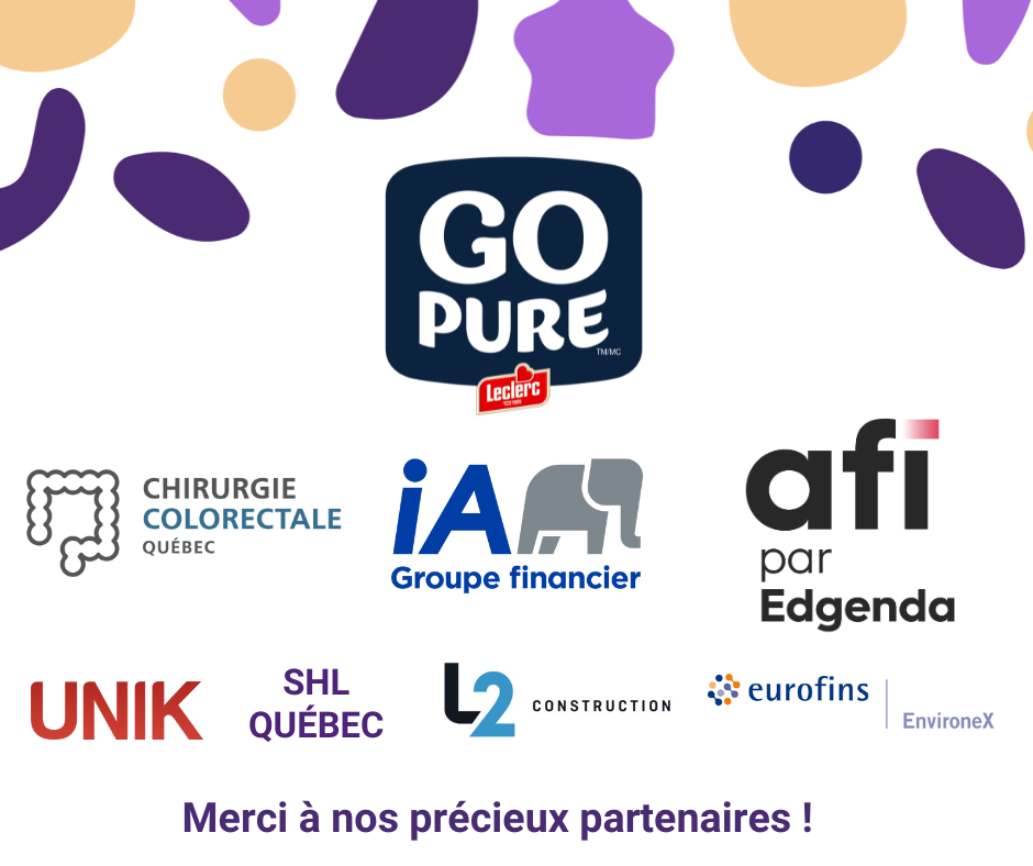 🙏 Merci à nos précieux partenaires : Go Pure de Leclerc, iA Groupe financier, Afi par Edgenda, Chirurgie colorectale Québec, SHL Québec, Unik Média, L2 Construction, EurosFins Environex et plusieurs autres.